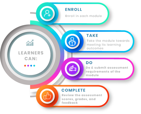 The modular ‘enroll-take-do-complete’ process enables learners to enroll in each module, take the module towards meeting its learning outcomes, do and submit the assessment requirements of the module, and complete the learning process by reviewing the assessment scores, grades, and feedback and ensuring that the learner has achieved the expected learning outcomes of the module.